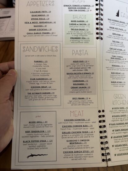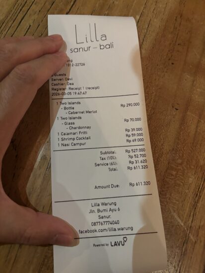 どのお店もGRABで片道約200円で行けるのがサヌールの魅力。ワインを頼まなければ1食1,000〜2,000円台でしっかり楽しめます。