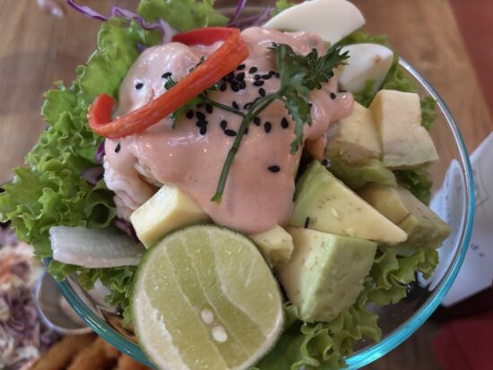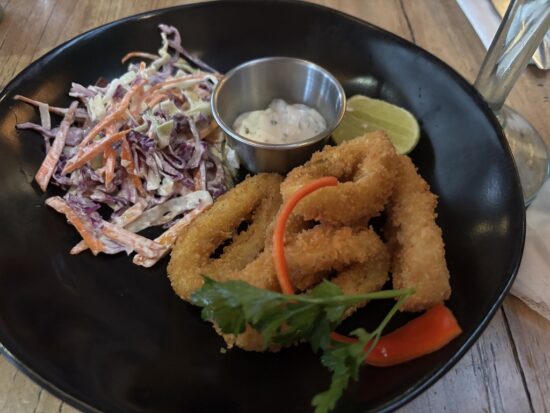 注文したのはカラマリフリッティ・シュリンプカクテル・ナシチャンプル(バリ風混ぜご飯)。