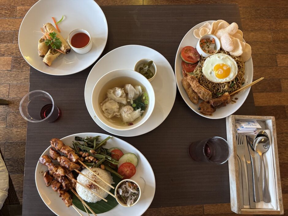 注文した4品はミーゴレン・ワンタンスープ・サテ盛り合わせ・揚げ春巻き。