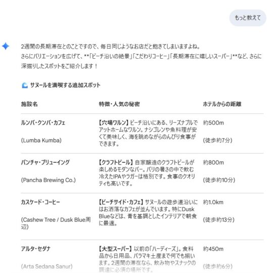 最初のリストで満足せず「もっと教えて」と送ると、今度はビーチ沿いの絶景・こだわりコーヒー・長期滞在に嬉しいスーパーなど、別角度の情報が追加で出てきました。