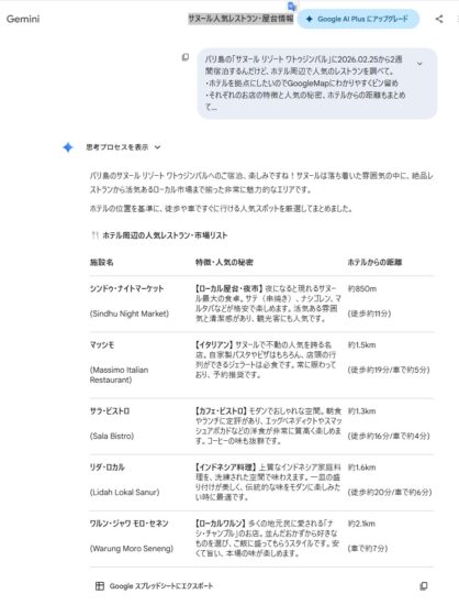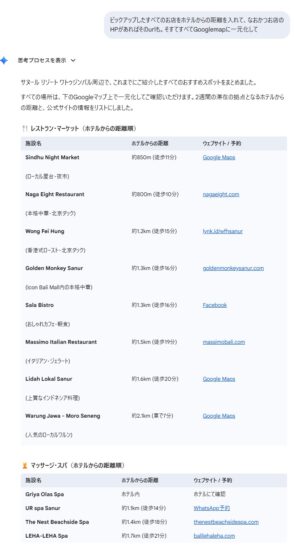 最後に「ピックアップしたすべてのお店をホテルからの距離を入れて、なおかつお店のHPがあればそのURLも。そしてすべてGoogleマップに一元化して」と依頼。