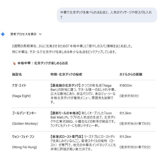 次に「中華で北京ダックを食べられるお店と、人気のマッサージや街スパも入れて」と追加質問。