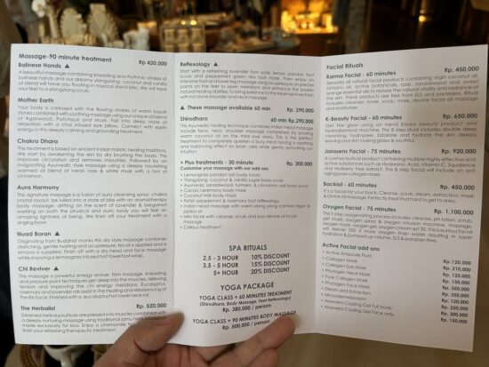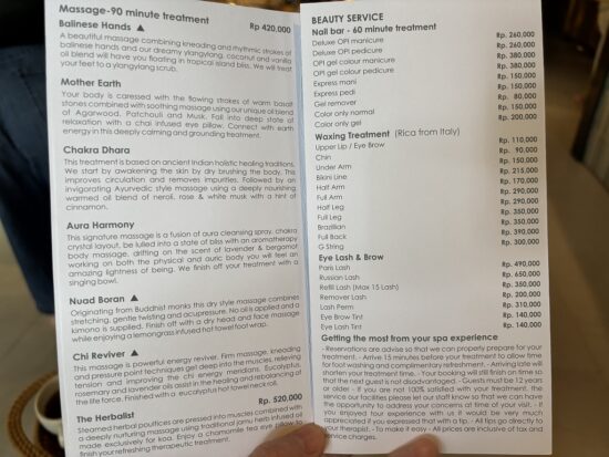 • 一般的なスパ:Rp20,000〜50,000(約200〜500円)が目安