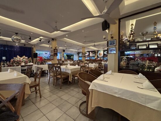 店内はほぼオープンエア構造で、天井のシーリングファンは回っているものの外気温とほぼ変わらない状態。