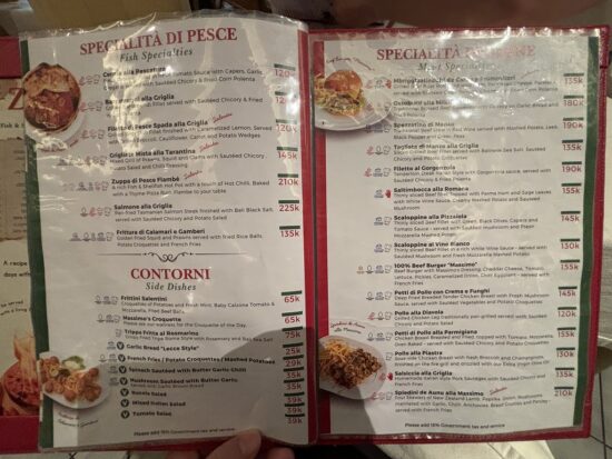 メニューはアンティパスト(前菜)・リゾット・ピザ・パスタ・魚料理・肉料理と本格イタリアンのフルラインナップ。
