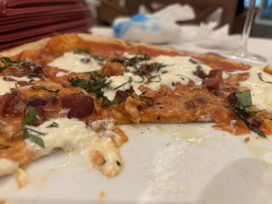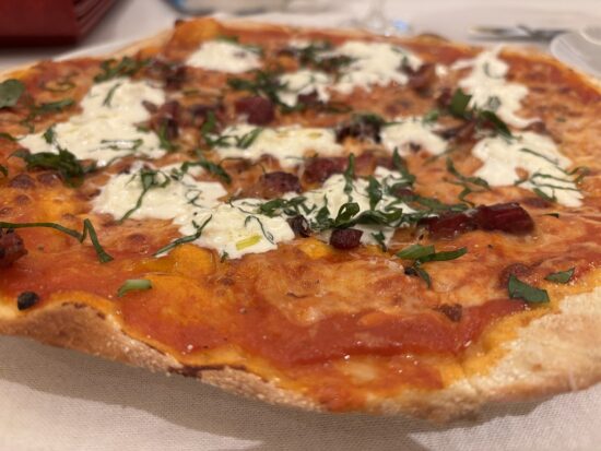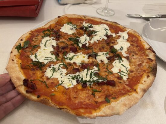 お腹いっぱいながらも注文したピザは、トマトソースにブラータチーズとグァンチャーレ(豚ほほ肉の塩漬け)が贅沢に乗った一品。