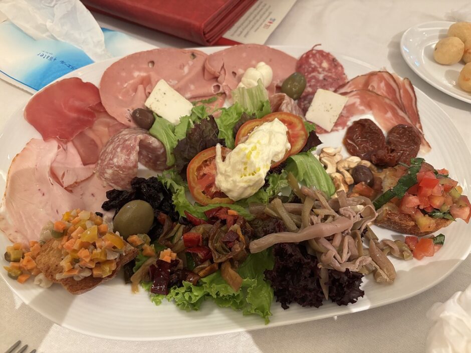 生ハム・サラミ・ブラータチーズ・ブルスケッタ・オリーブ・ピクルス・マッシュルームのマリネなど10種類以上が美しく盛り付けられていて、グラスワインとの相性が抜群でした。
