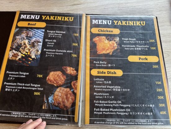 焼肉メニュー(牛肉)はタンサンバル(Rp18,000)・カルビ(Rp38,000)・上ハラミ(Rp78,000)・上タン(Rp78,000)・厚切り上タン(Rp98,000)とラインナップが充実。