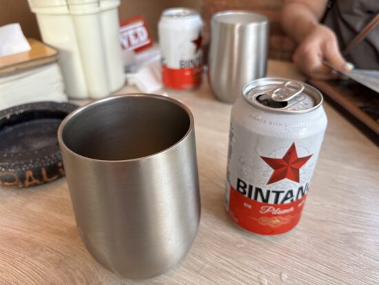 ビンタンビールはステンレスのタンブラーグラスで提供してくれます。これが雰囲気抜群でした。