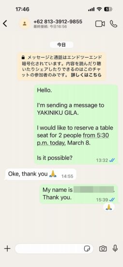 口コミも良く普通の焼肉屋さんっぽかったので、WhatsAppでメッセージを送ったらすぐに予約OKの返信が来て一安心。