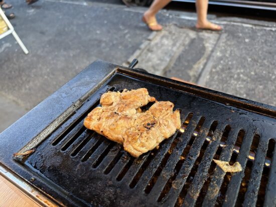 夕暮れのサヌールの路上で食べる焼肉は格別でした。