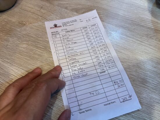 - 小計Rp719,000・サービス料5%込み合計:Rp755,000(約7,313円)