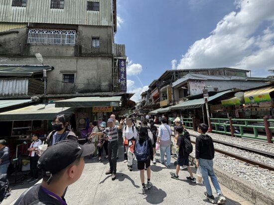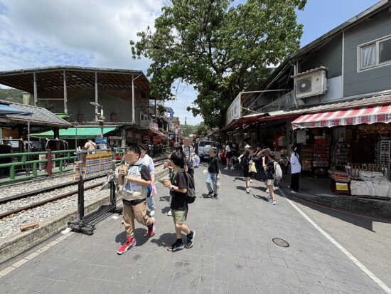 線路の左右にびっしりとお店が立ち並ぶ十分老街。