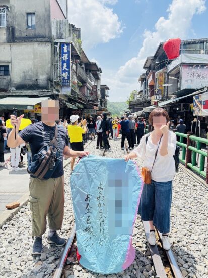 実際にランタンに自分たちの願いを大きな筆で書き入れ、線路の上に立ちランタンを大空高く舞い上げる時間は、他では味わえない特別な体験でした。