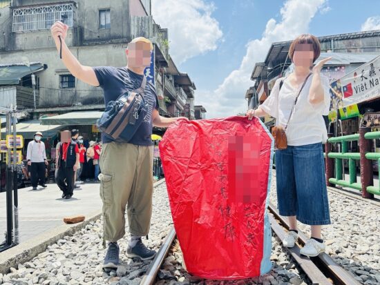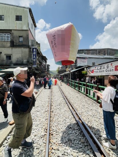 最初は、線路のすぐ脇に商店がひしめく独特の景観で知られる十分での「天燈(ランタン)上げ」体験。