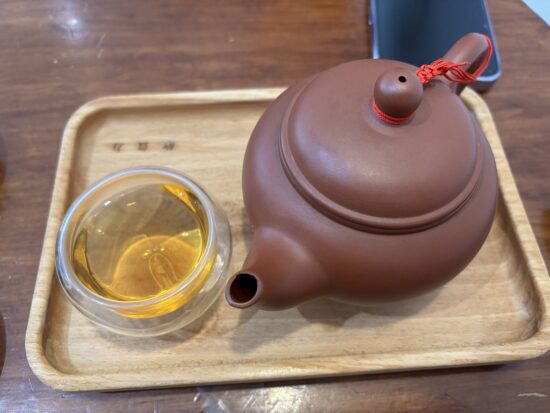 可愛らしい茶器で供される台湾茶で、重厚な急須と二重構造のグラスが、伝統的なお茶文化を現代的に演出しています。