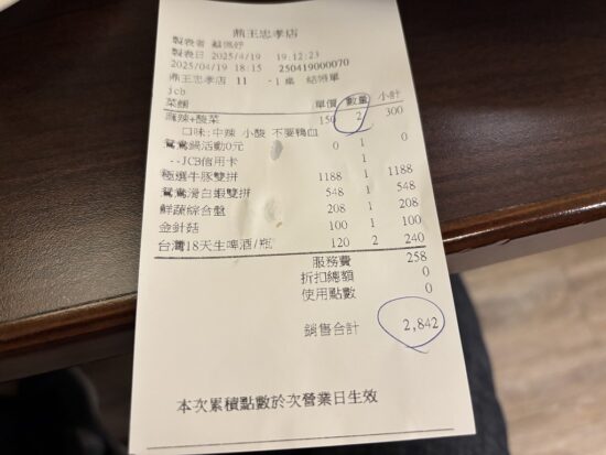 お会計は2,842NT$(14,000円)