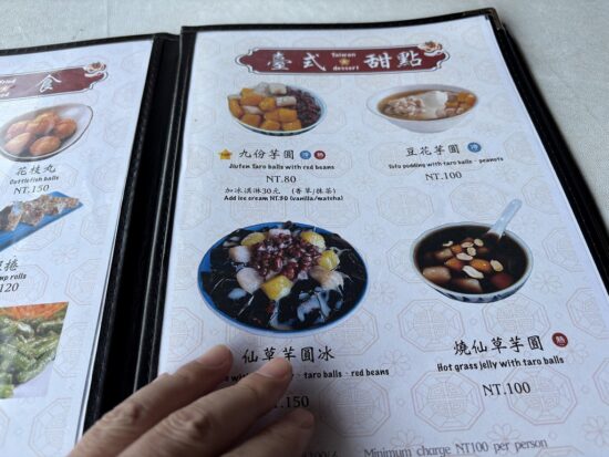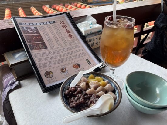 私はバックスキン瓶ビールと九份の名物スイーツ「九份芋圓(ジョウフェンユーユェン)。